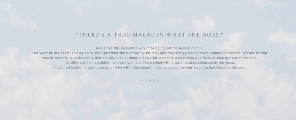 Bringing over a decade of photography experience, Jessie collaborates with clients to provide them with tangible art that they will cherish long after the wedding day. Combining medium format film and digital photography, Jessie is able to achieve the ethereal romance you see in her photographs, thus providing clients with images that have a truly beautiful, timeless aesthetic. Her photographic style has been described as elegant, candid, and editorial. Clients are often captivated by her use of light, composition, and the unique vision she brings to the wedding day.